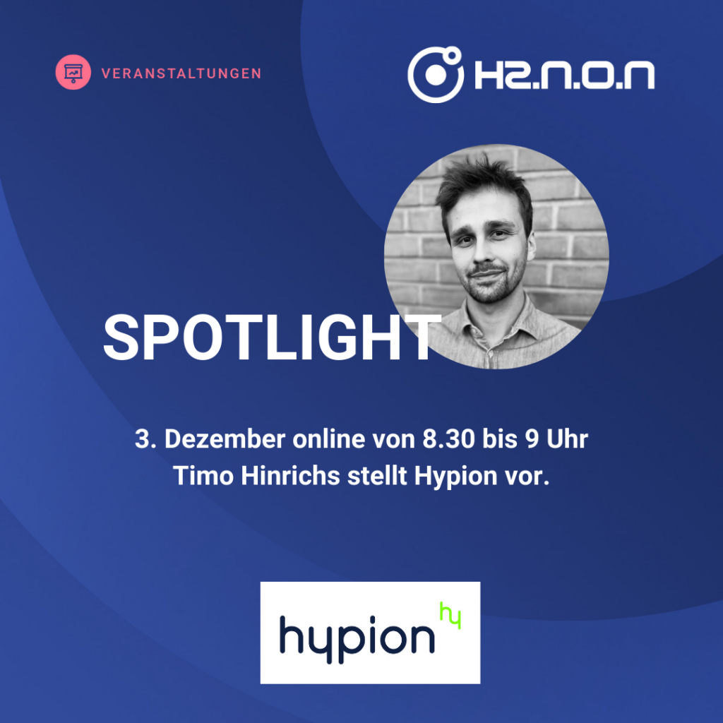Unser Spotlight geht weiter! Am 3. Dezember präsentiert Timo Hinrichs den Projektentwickler Hypion. Im Fokus steht dabei die Entwicklung von integrierten regionalen Gesamtprojekten in der Wasserstoffwirtschaft, von der Produktion über die Verteilung bis zur Abnahme.