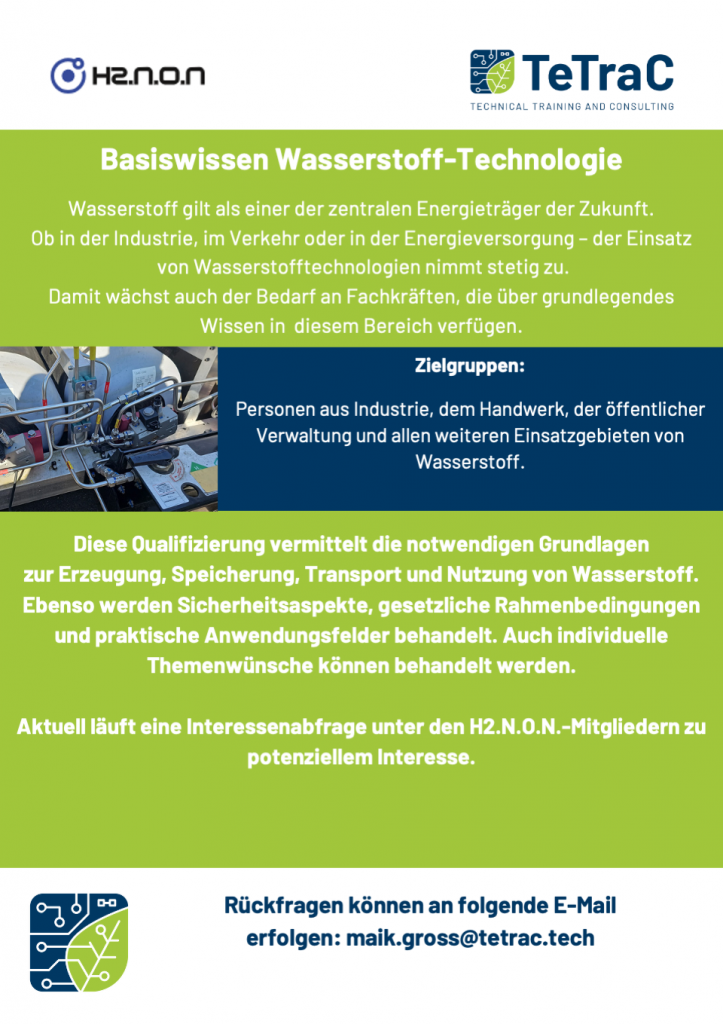 Unser Netzwerkmitglied TeTraC kann unseren Netzwerkmitgliedern Weiterbildungen zu Basiswissen in der Wasserstoff-Technologie zu besonderen Konditionen anbieten. Die Weiterbildungen richten sich an Personen aus Industrie, Handwerk, öffentlicher Verwaltung und weiteren Einsatzgebieten von Wasserstoff. Wenn es für Ihre Belegschaft Interesse daran besteht, füllen Sie gerne die kurze Umfrage zu der Anazhl interessierter Personen und Themenwünschen aus.